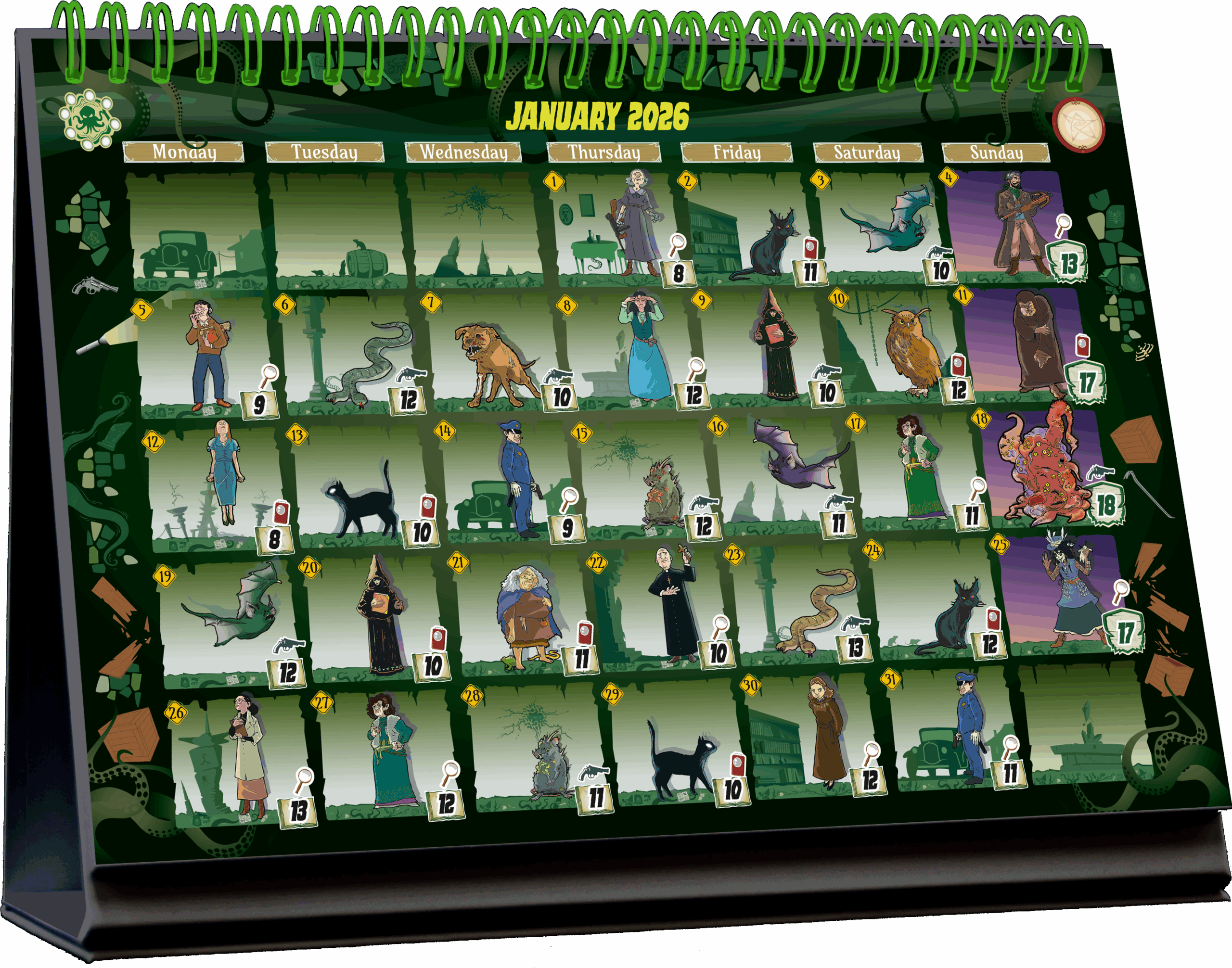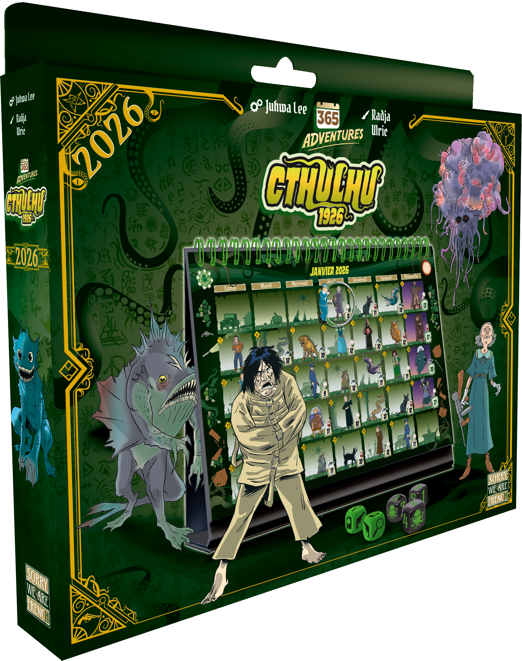 In the shadows of the ancient buildings and cobbled streets of Arkham, a city consumed by mysteries and age-old secrets, private detective John Miller finds himself confronted with unspeakable horrors. Rumors of inhuman creatures and dark cults are multiplying. Armed with his flashlight, a pistol, and his determination, John is prepared to delve into the darkness to unveil the horrors that lurk there. 365 Adventures: Cthulhu 1926 is a unique experience that combines a calendar and an adventure game, allowing you to embark on a cosmic year-long investigation! Day after day, guide your detective through the dark alleys of Arkham, exploring hidden secrets and confronting occult cults devoted to the Great Old Ones. Keep track of your monthly score, and unlock new rules and occult artifacts as you progress. You need only five minutes maximum each day to play: 1- Move your investigator. 2- Roll your dice up to three times. 3- Choose an encounter to defeat. At the end of the month, manage your madness, note your score, and advance to the next month, where new atmosphere text and a new rule await you.