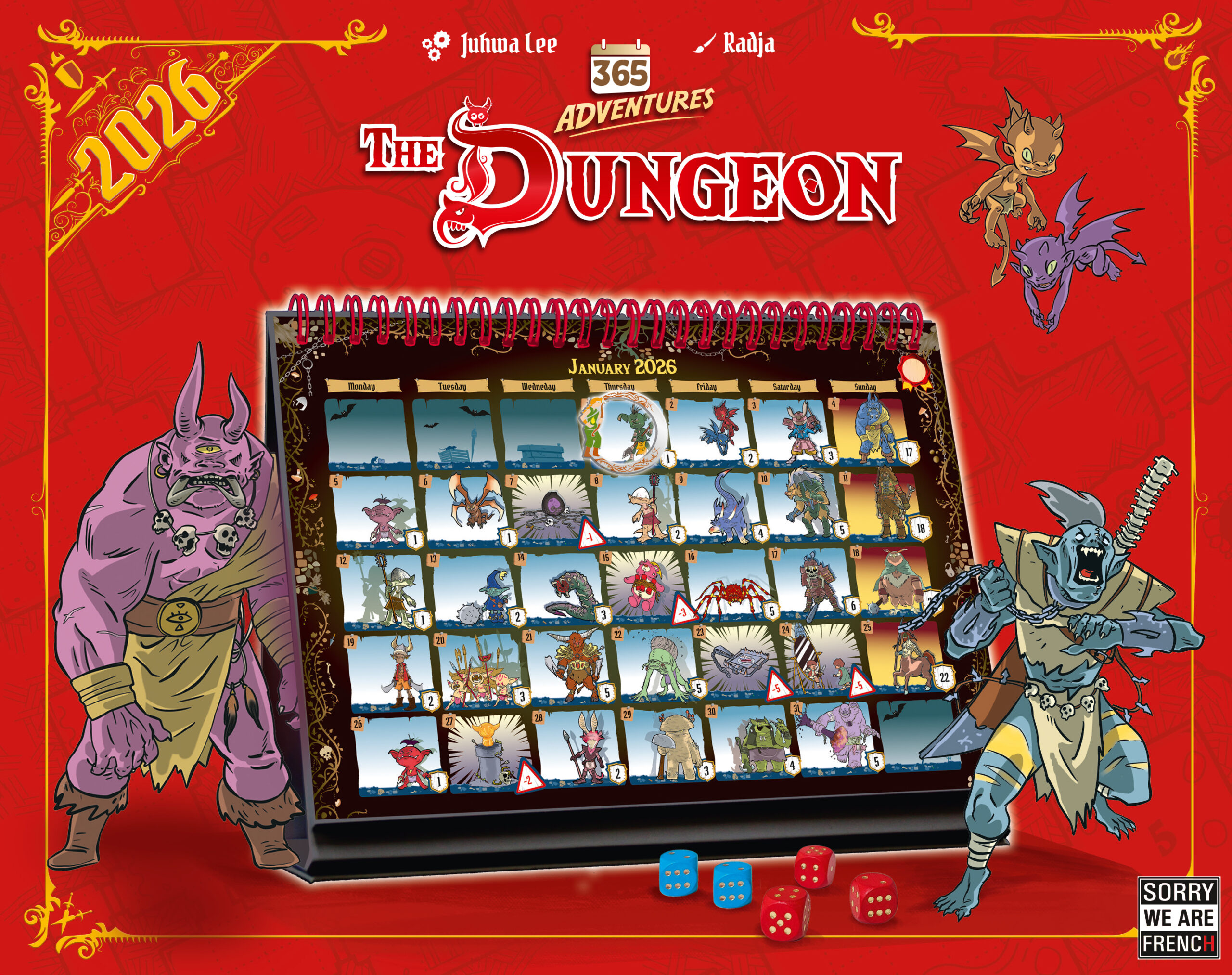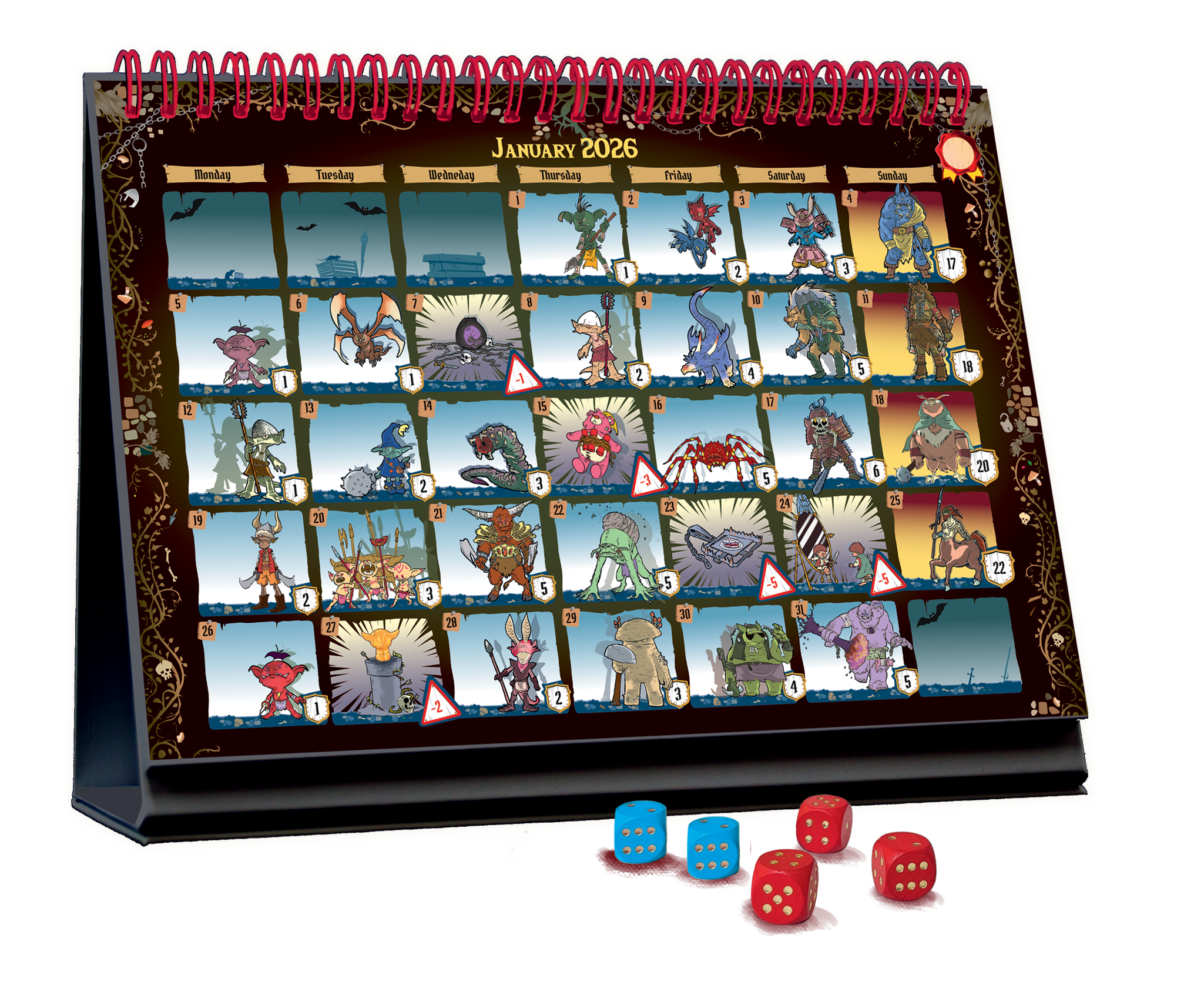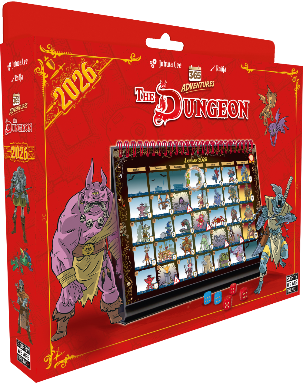 Whispers of a dark force deep within the dungeon, the master of the undead, spread fear throughout the villagers. That’s why Mira, armed with her magic, her bow and an unshakeable will, sets out into the dungeon. She knows that only by conquering these horrors can she bring peace to her homeland. 365 Adventures – The Dungeon 2026 is a unique experience that cleverly combines a calendar and an adventure game for 2026. This 2026 Dungeon brings new rules to discover ! Day after day, guide Mira through the Dungeon, exploring each floor and confronting the shackled undead and unexpected surprises. Keep track of your monthly score, upgrade your gear with magical items and unlock new rules as you progress. You only need 5 minutes maximum each day to play. 1- Move your hero to the current day 2- Roll your dice up to 3 times 3- Choose a monster of the week to fight At the end of the month, note down your score and move on to the next month, where a new atmosphere text and a new rule await you.