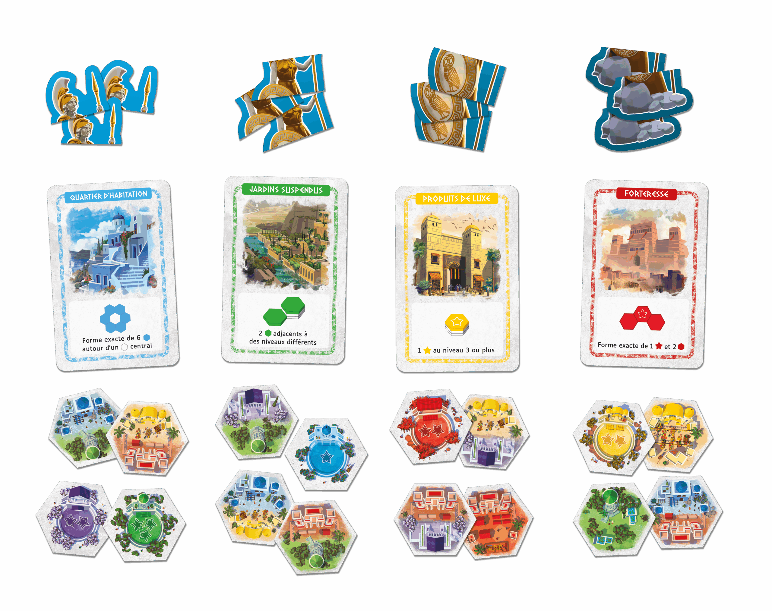 • 18 Construction cards • 30 Mini-tiles • 4 Statues of Athena • Rules