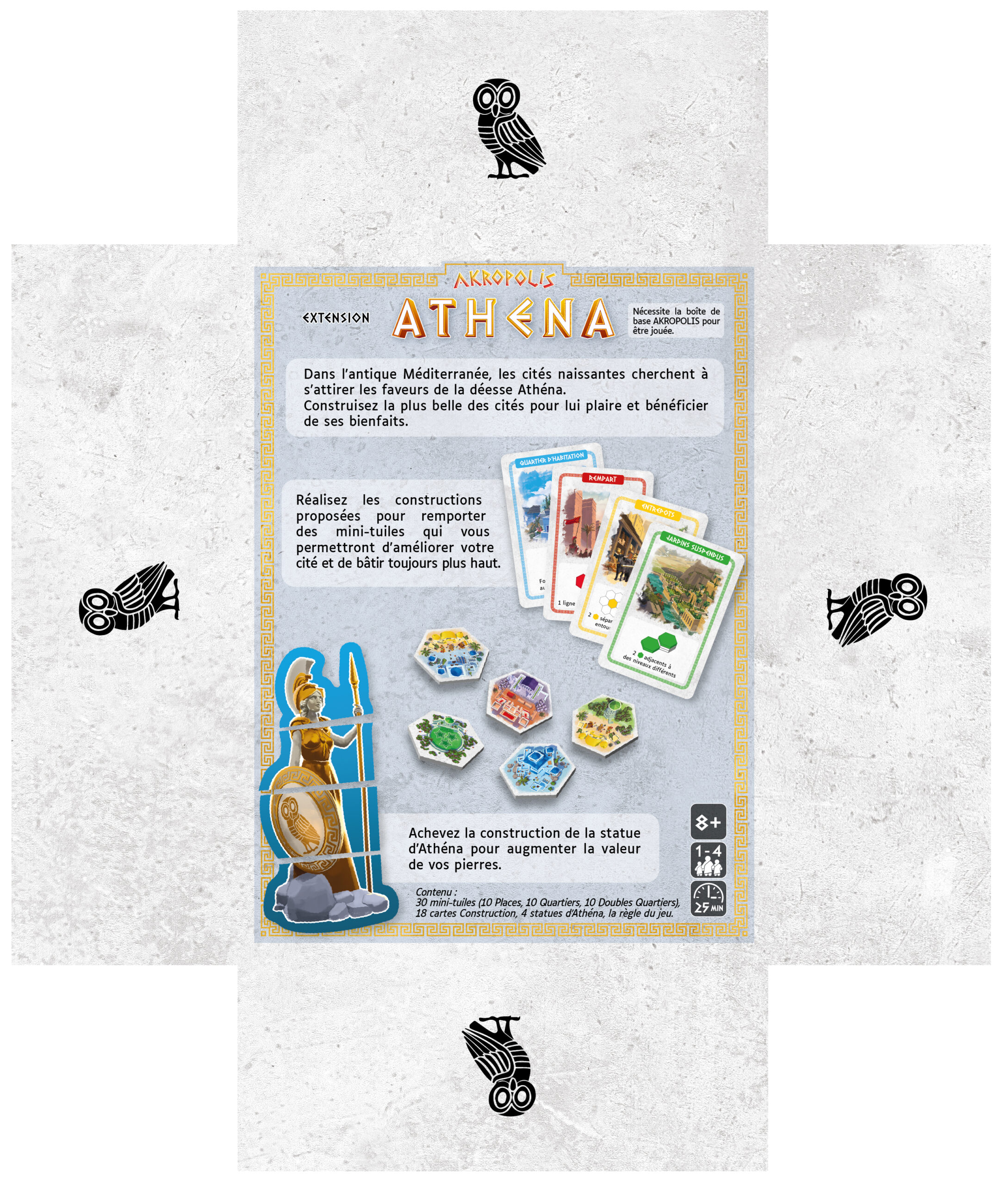 Expand your city with the wisdom of Athena! Akropolis: Athena is an expansion to the hit game Akropolis, adding new layers of strategy through Construction cards and the favor of the goddess Athena. Build specific layouts to complete challenges, earn mini-tiles, and assemble the majestic Statue of Athena for powerful bonuses. Combine the core gameplay of Akropolis with fresh objectives and new scoring opportunities. Complete each Construction card once, plan your city wisely, and rise above your rivals to claim the most prestigious metropolis in the Mediterranean.