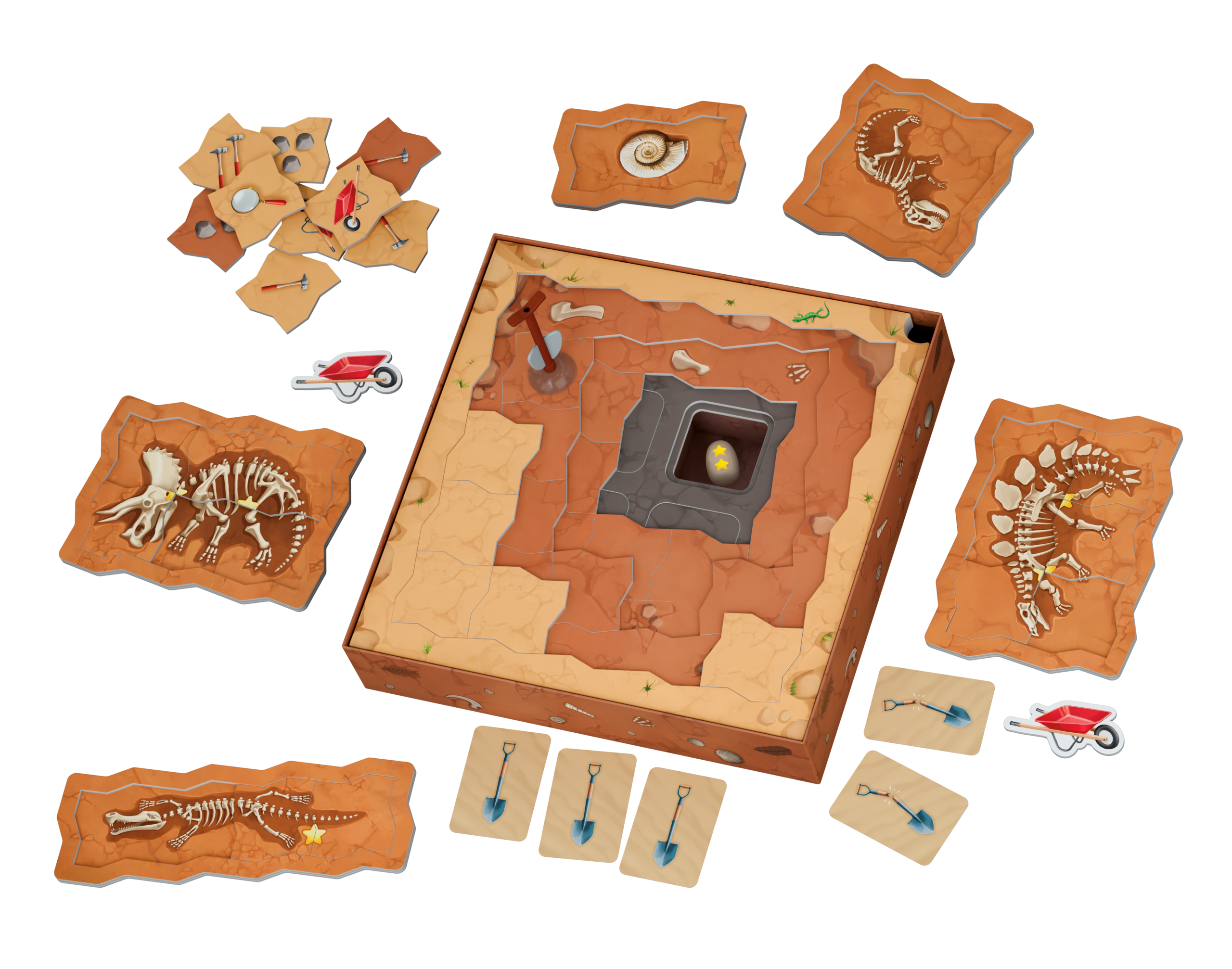 • 1 Dig site • 50 Earth tiles • 4 Discovery tiles • 5 Fossil boards • A Suction shovel • 3 wooden Eggs • 1 Rocks tocken • 5 Wheelbarrow tokens • 11 Cards • Rules