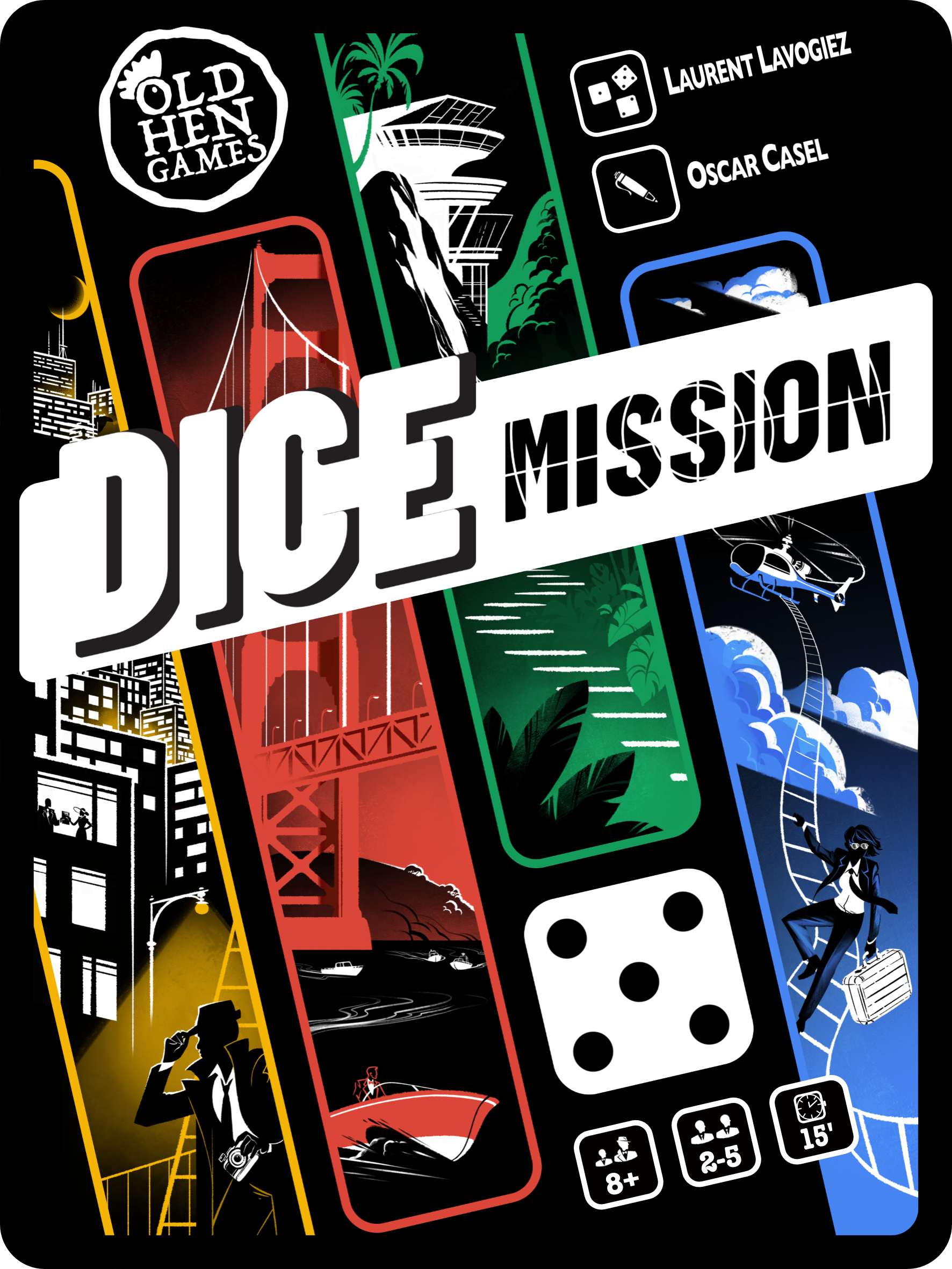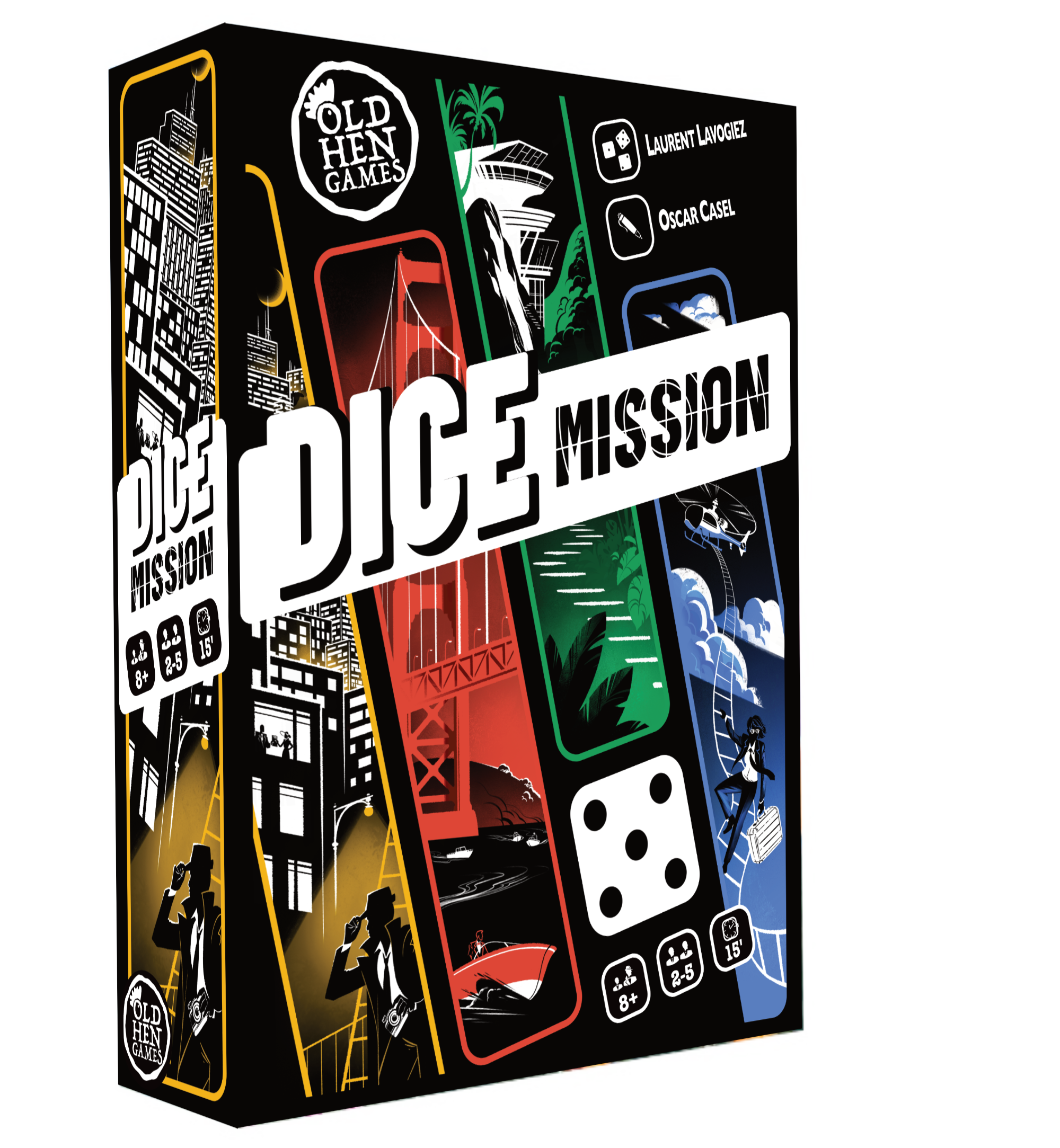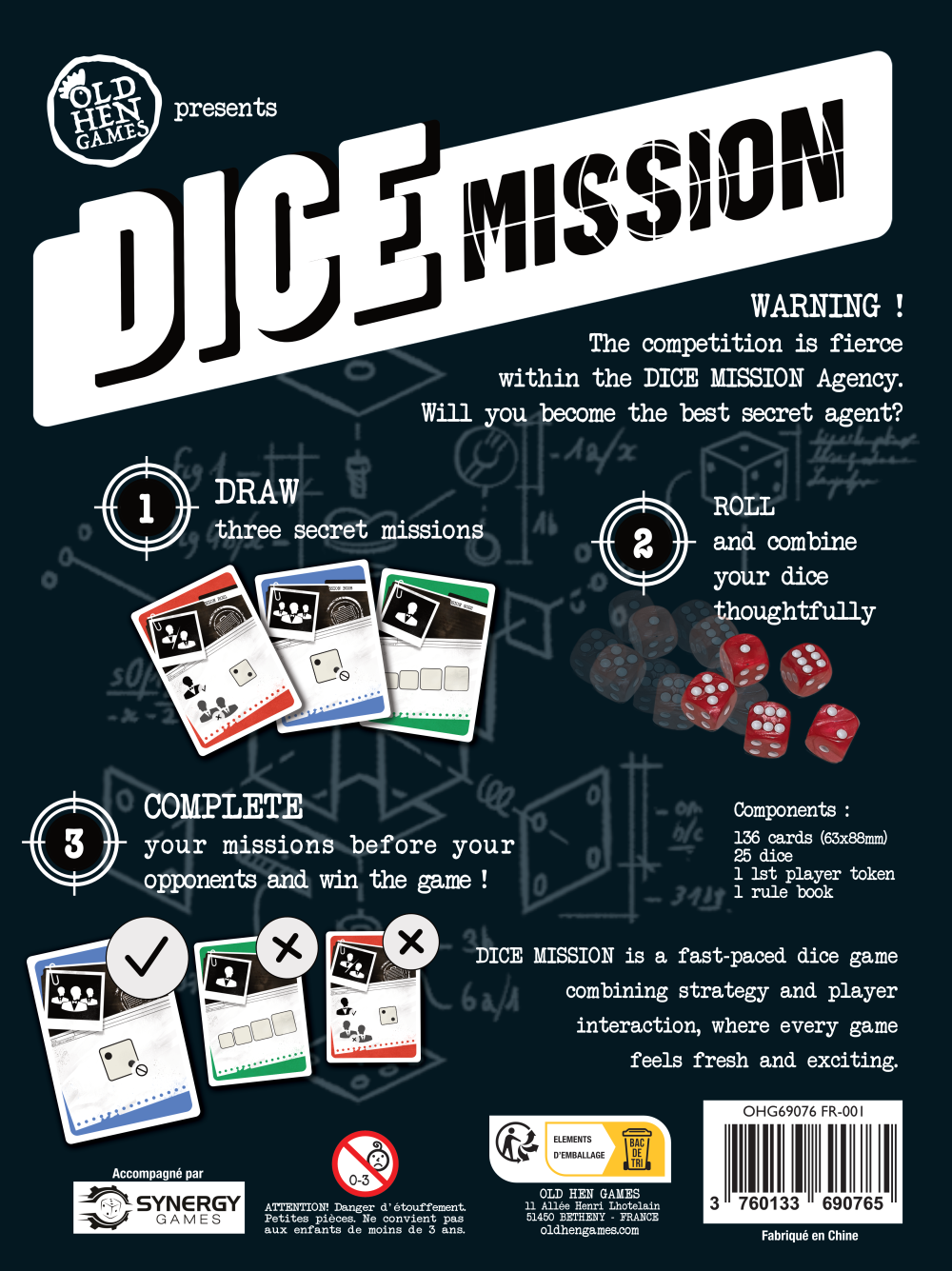 In Dice Mission, the Director of the agency has set the agents the goal of validating their Mission cards as quickly as possible by combining their dice with those of their opponents.The Dice Mission Agency provides its agents with gadgets to help them influence the results of the dice rolls. Change from Yams to secret agent! Set the tempo and use your gadgets to finish your missions first! Beware! Competition is fierce at the DICE MISSION Agency. Will you become the best secret agent? Your weapon? 5 dice to complete your 4 missions as quickly as possible. Will you prove your worth by being the first to play your cards and achieve your objectives? Dice Mission is a game of dice combinations, combining interaction and strategy, for frenzied games of ever-renewed interest. 1. Draw three secret missions. 2. Roll and combine your dice with tricks. 3. Complete your missions and one of the missions common to all the players before your opponents and win the game!