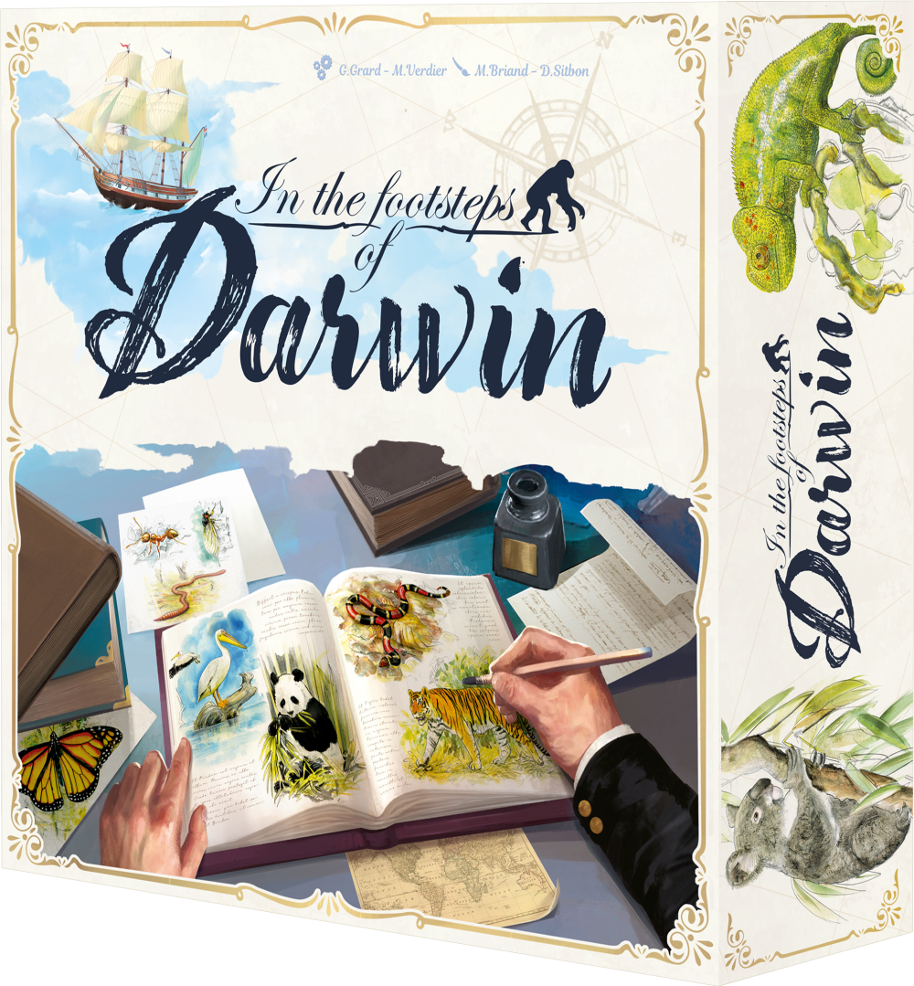 Follow the trail of Darwin and embark on the Beagle! The year is 1856. To complete the writing of On the Origin of Species, Darwin needs you! Twenty years after his expedition around the world, he wants to gather new information about animal life, particularly on continents where he barely set foot, such as North America, Asia and part of Africa. Now too old and too busy writing and taking care of his family, he entrusts you with this mission – after all, you were recommended by his colleagues from the Royal Society of London! Who else than young naturalists eager for discovery could help the renowned scholar to complete the writing of his most famous work? Players are junior naturalists just arrived aboard the Beagle to help Charles Darwin finish his book On the Origin of Species. During this journey, you will study animals, carry out cartographic surveys, publish your findings and develop theories. Your goal is to score more Victory Points (VP) than your opponents to determine who contributed the most to the Origin of Species!