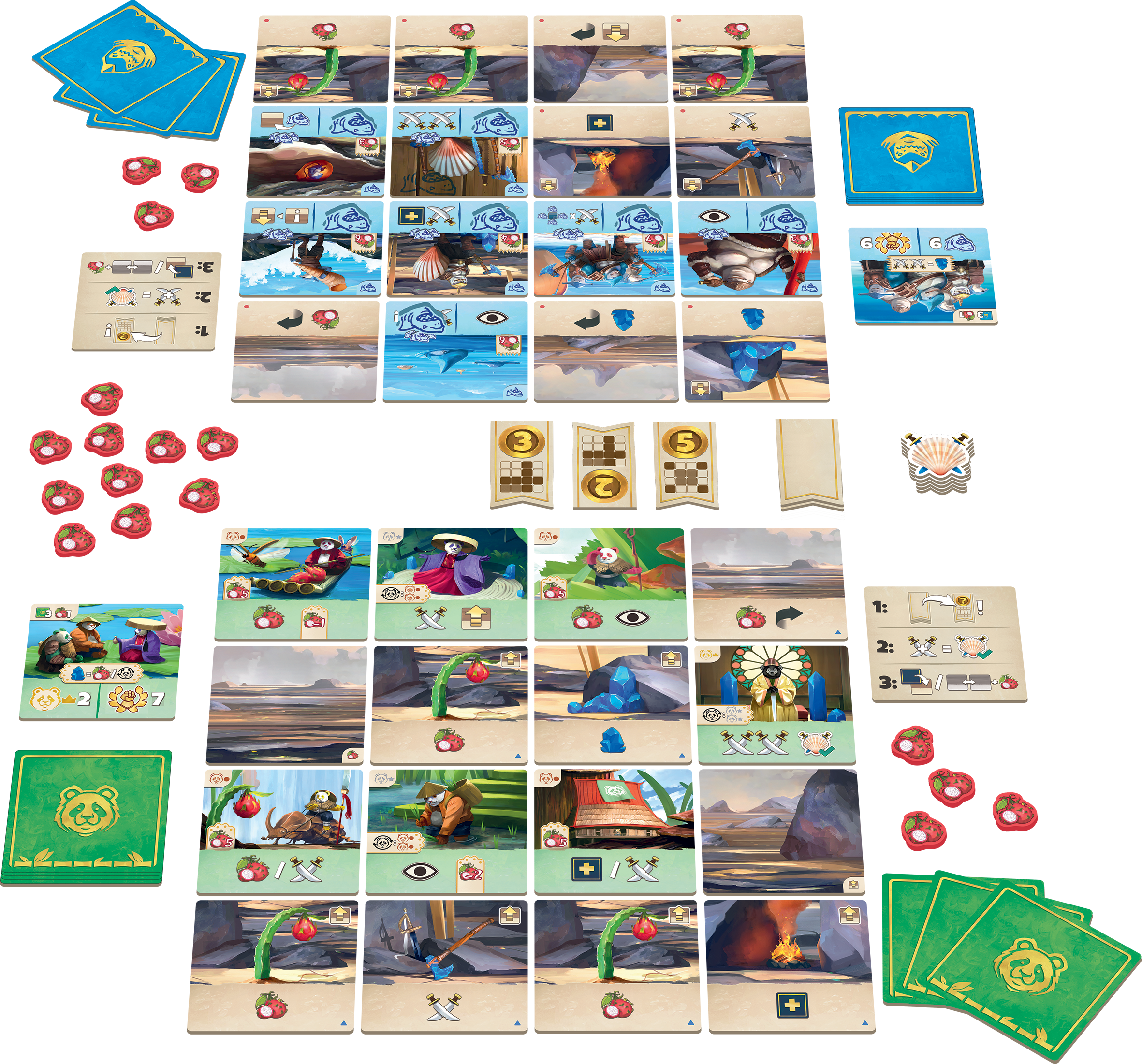 32 tuiles basiques recto-verso (16 pour chaque joueur), 52 cartes (7x7cm), 5 tuiles Action, 20 pions Nourriture, 9 pions Requin, 18 jetons Victoire Militaire, 4 fiches de Clan, 1 livret de règles