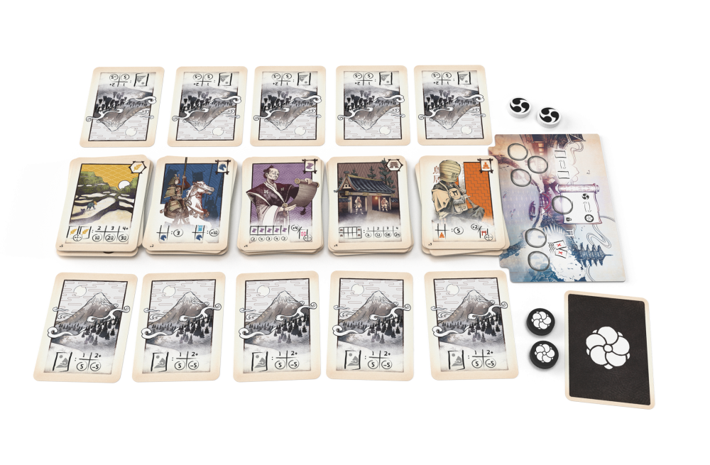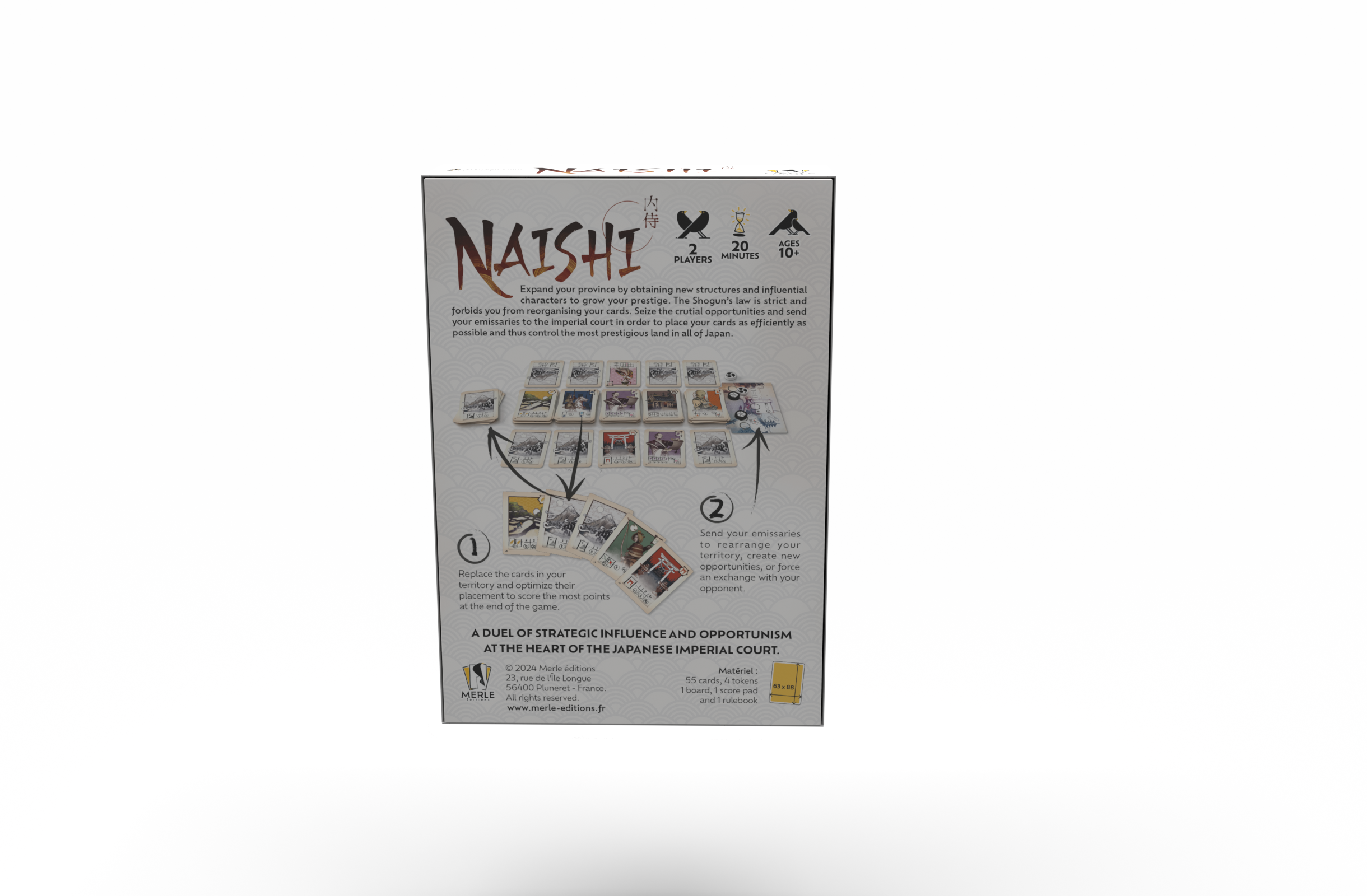 A two-player hand optimisation and tableau-building game. In Naishi, you will seek to improve your Japanese state as efficiently as possible. However, you will not be free to change the positioning of your cards at will. You must replace the cards in your hand and in your tableau with cards from the central river while respecting their positioning. You will also have the possibility to send your emissaries to reorganise states, create new opportunities or force your opponent into a trade
