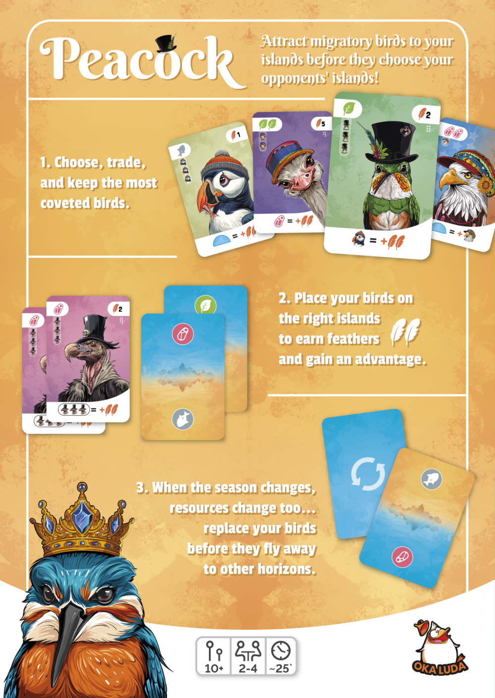 Attract migrating birds to your islands and build the most stunning archipelago. Choose, trade, and place your birds to score as many feathers as possible. But as the seasons shift, the resources change too… rearrange them before they spread their wings and fly off to new horizons!
