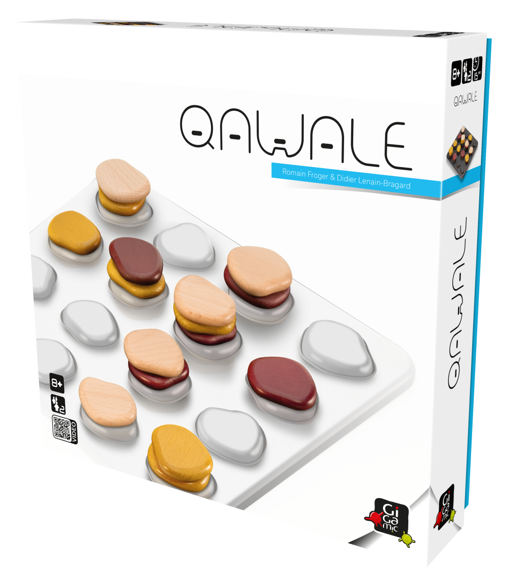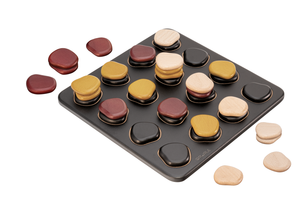 Simple and tactical at the same time, Qawale finds its inspiration in the piles of pebbles found along paths. Like these meandering stones, prepare to be transported by the many twists and turns of this incredible game. Each player obtains 8 pebbles in their color. The third color is neutral, and these pebbles are placed in the 4 corners of the board. On their turn, players add a pebble to the top of a stack of their choice before moving it. When moving a pile, players have to leave one pebble on each space crossed. The first player lining up 4 pebbles of their color from top view wins the game.