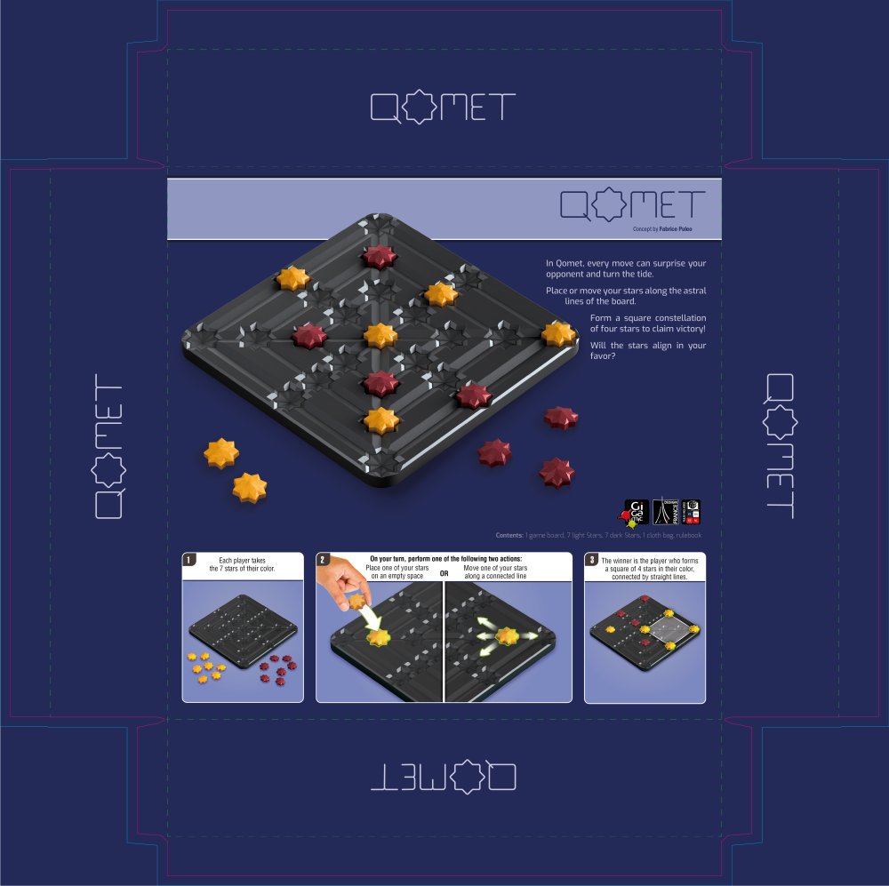·  1 game board with 25 spaces ·  7 light « Star » tokens ·  7 dark « Star » tokens ·  A storage bag ·  Game rules