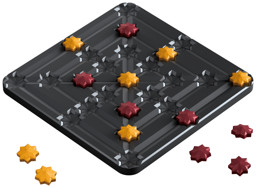 Create a square of any size connected by lines. Each player starts with 7 stars. On your turn, you can play a new star of your color on the board or move a star of your color you played previously. If you move, you go to the next square connected by a line. If this square is empty, nothing else happens. If this square is occupied, push the star no matter its color. You can’t push more than one star. You can push stars outside of the board.