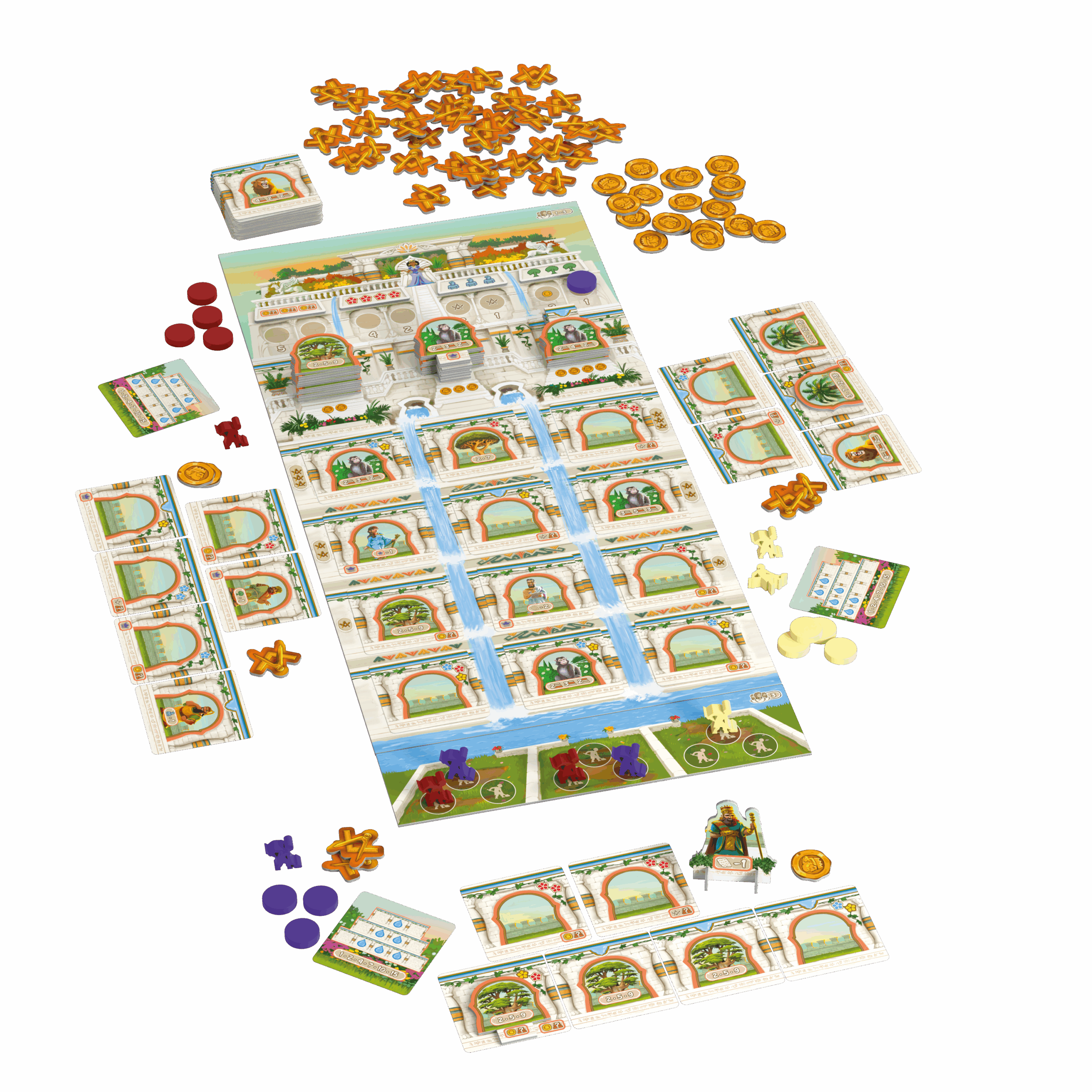 In The Hanging Gardens, players compete to build the most beautiful garden for King Nebuchadnezzar II over four rounds. Each turn, they select and place Garden cards to construct a multi-level garden, fulfill objectives, and optimize features like flowers, trees, animals, and irrigation. Points are scored based on card placement, completed objectives, and feature arrangements. The player with the most points at the end wins, emphasizing strategic planning and resource management.